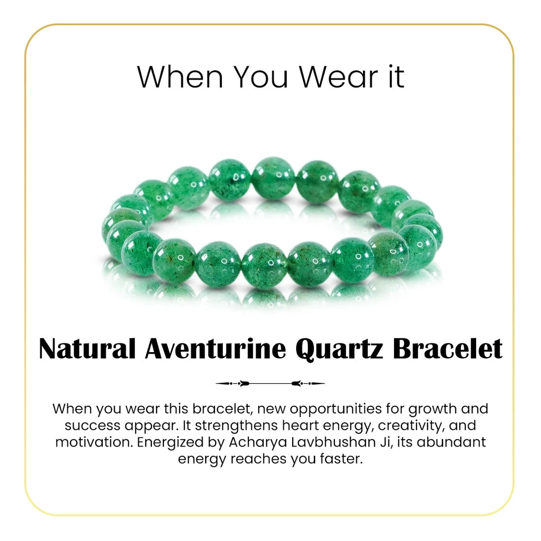 "The Natural Aventurine Quartz Bracelet is crafted using carefully selected natural Aventurine Quartz crystal beads, known for their unique energetic properties. Each bead measures approximately 8 mm, making the bracelet comfortable for daily wear while maintaining strong energetic presence. This bracelet is designed for those seeking balance, emotional clarity, and steady personal growth. The smooth, polished Aventurine Quartz beads sit gently on the skin, making it suitable for long hours of wear. Every piece is quality-checked to ensure authenticity, durability, and consistency in bead size."