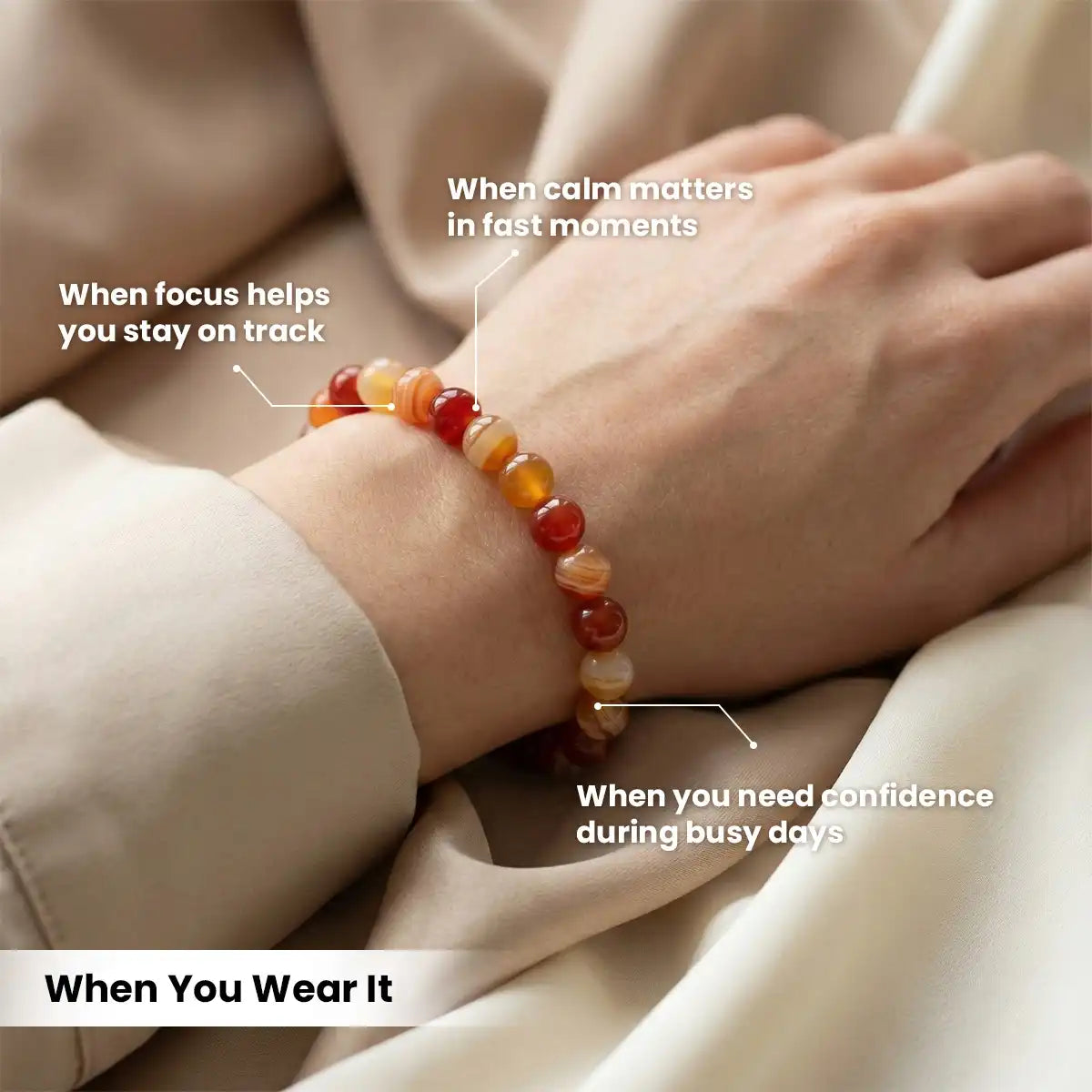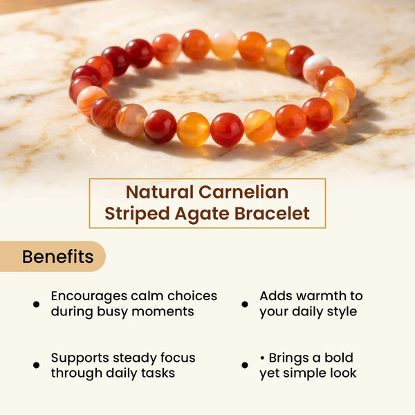 "The Natural Carnelian Striped Agate Bracelet is crafted using carefully selected natural Carnelian Striped Agate crystal beads, known for their unique energetic properties. Each bead measures approximately 8 mm, making the bracelet comfortable for daily wear while maintaining strong energetic presence. This bracelet is designed for those seeking balance, emotional clarity, and steady personal growth. The smooth, polished Carnelian Striped Agate beads sit gently on the skin, making it suitable for long hours of wear. Every piece is quality-checked to ensure authenticity, durability, and consistency in bead size."