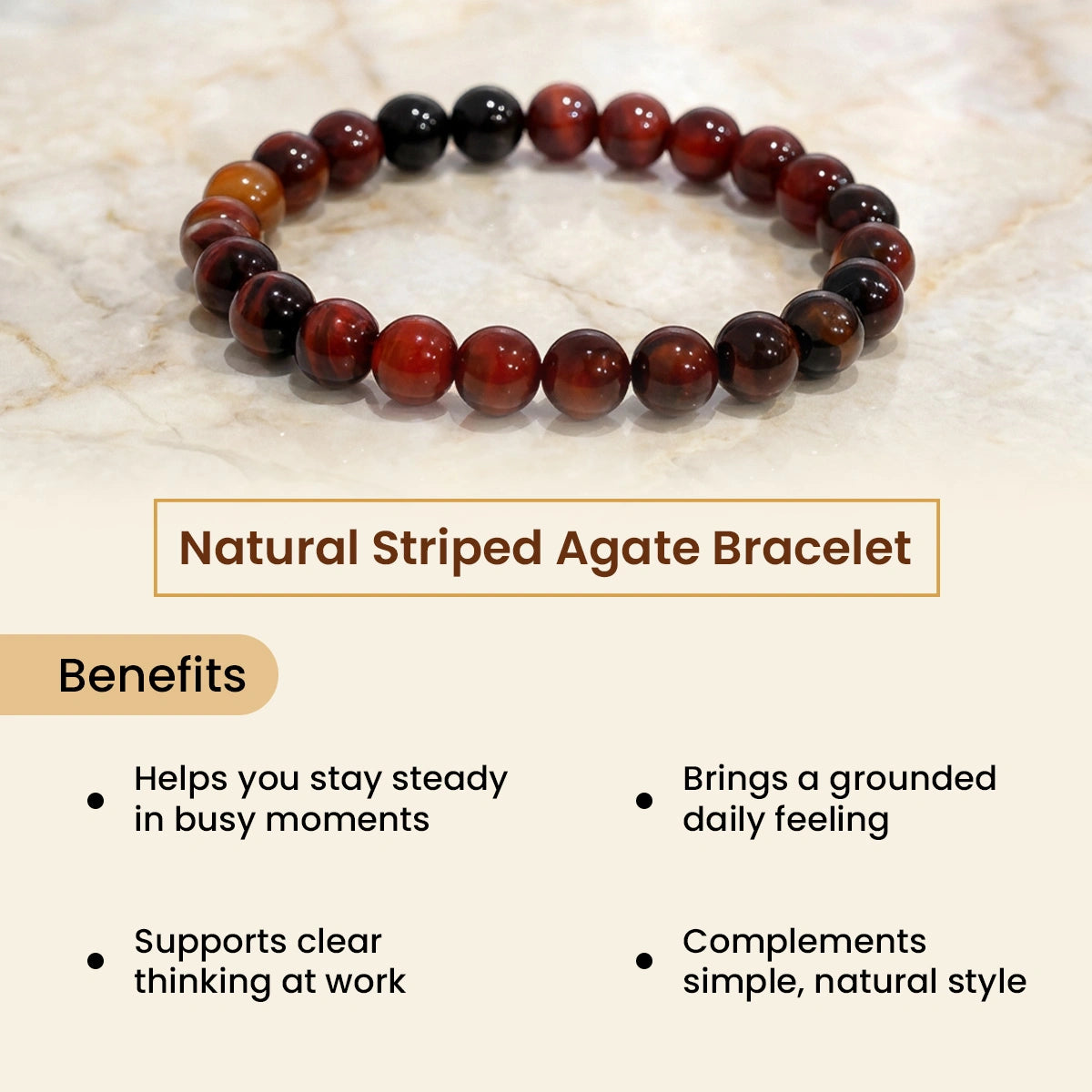 The Natural Striped Agate Bracelet is crafted using carefully selected natural Striped Agate crystal beads, known for their unique energetic properties. Each bead measures approximately 8 mm, making the bracelet comfortable for daily wear while maintaining strong energetic presence. This bracelet is designed for those seeking balance, emotional clarity, and steady personal growth. The smooth, polished Striped Agate beads sit gently on the skin, making it suitable for long hours of wear. Every piece is quality-checked to ensure authenticity, durability, and consistency in bead size.