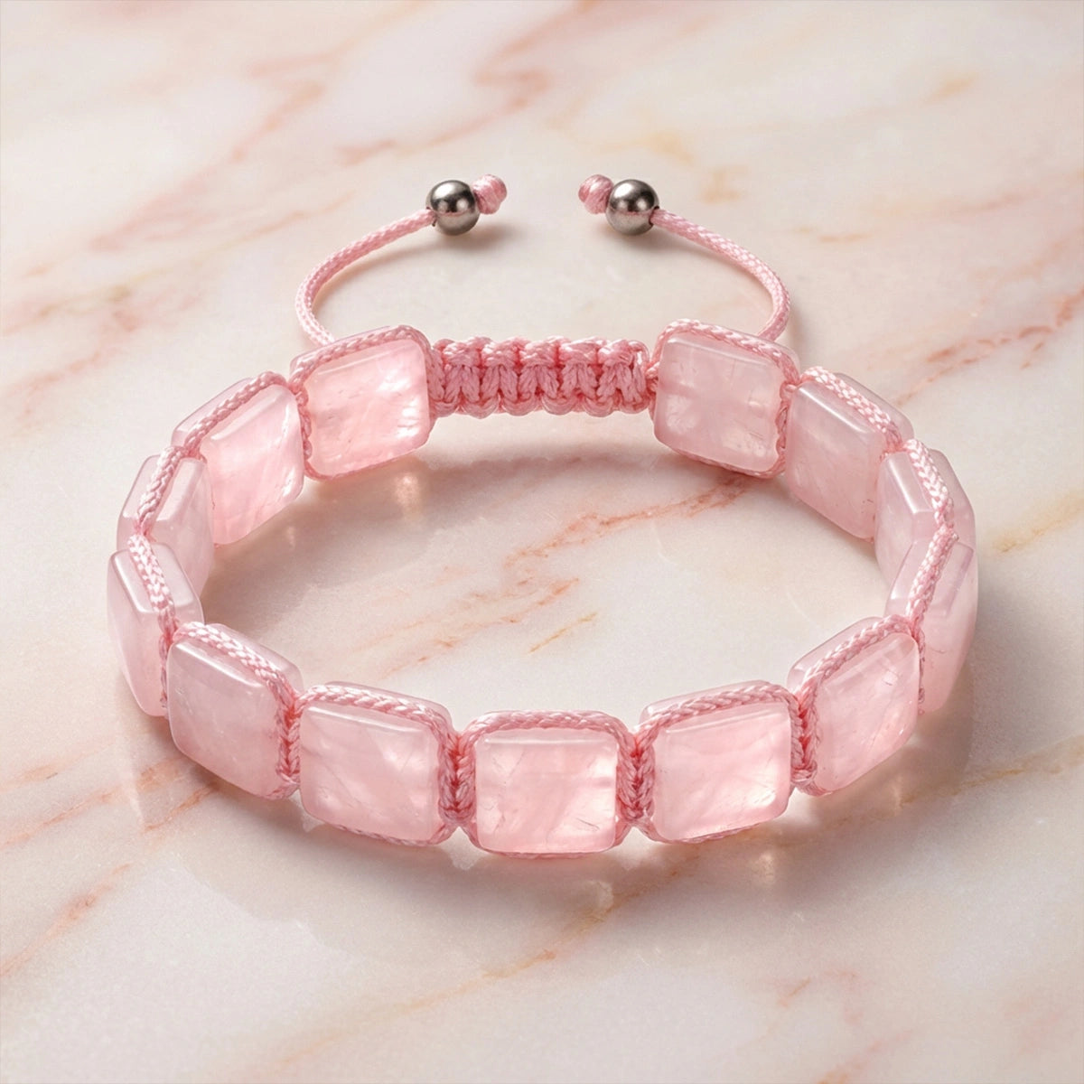 With smooth, polished 8 mm Rose Quartz beads, the bracelet offers a b energetic presence while remaining light and comfortable for long hours of wear.
