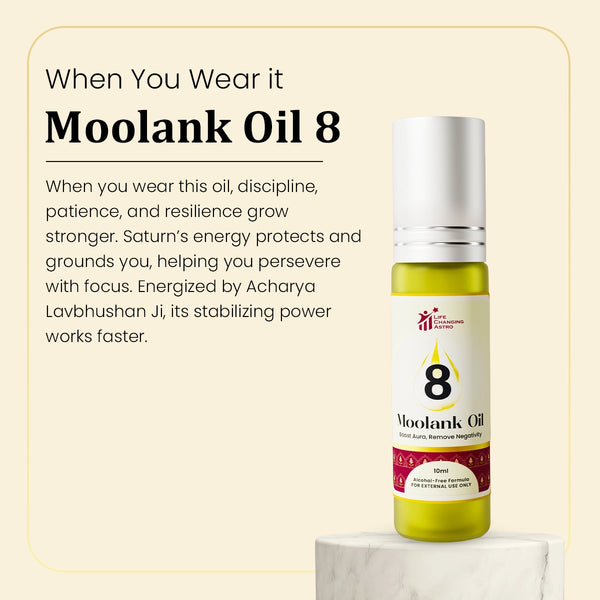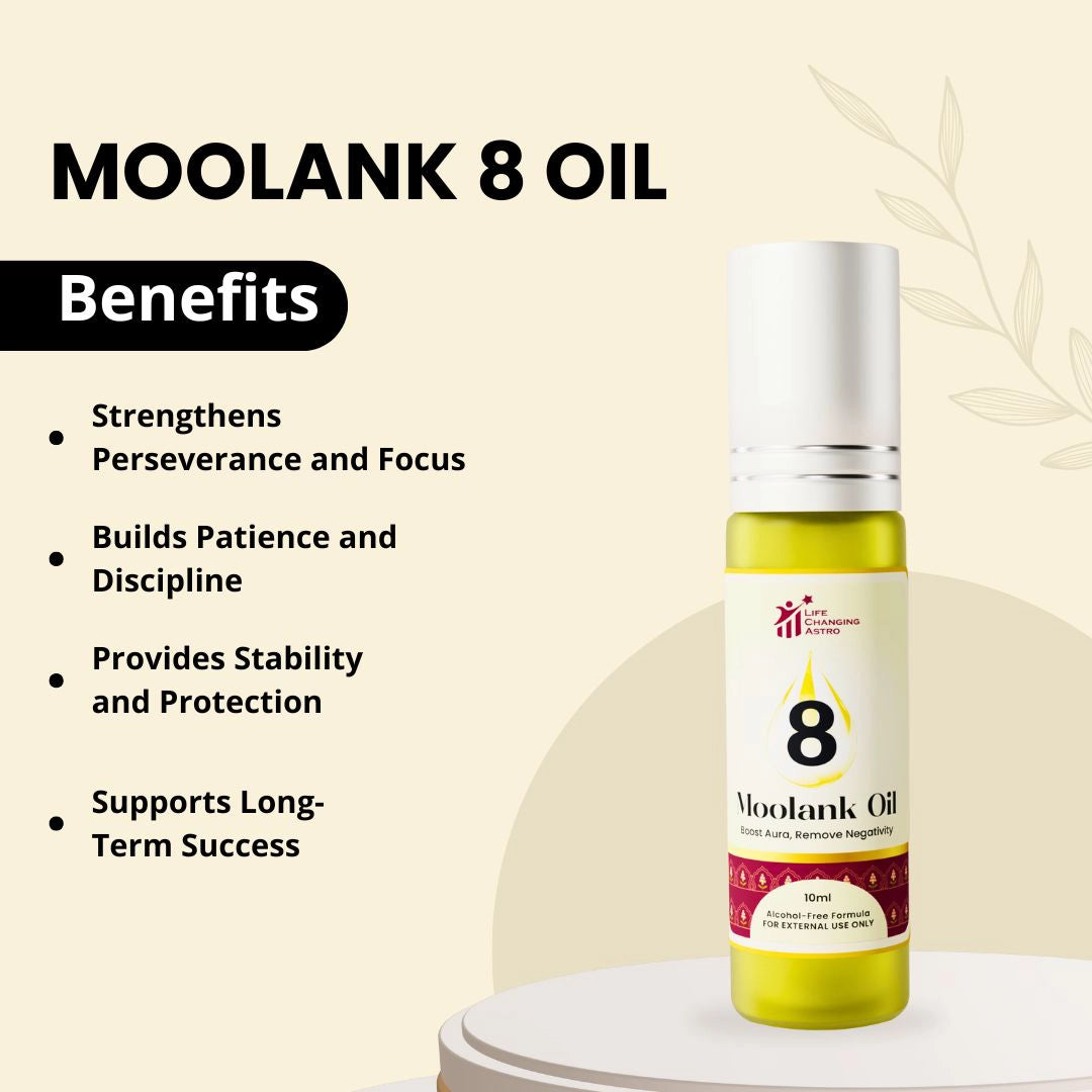 The Moolank 8 Oil channels the strength and discipline of Saturn (Shani), crafted to support perseverance, patience, and focus. Ideal for those born on 8, 17, 26, it offers stabilizing and protective qualities.