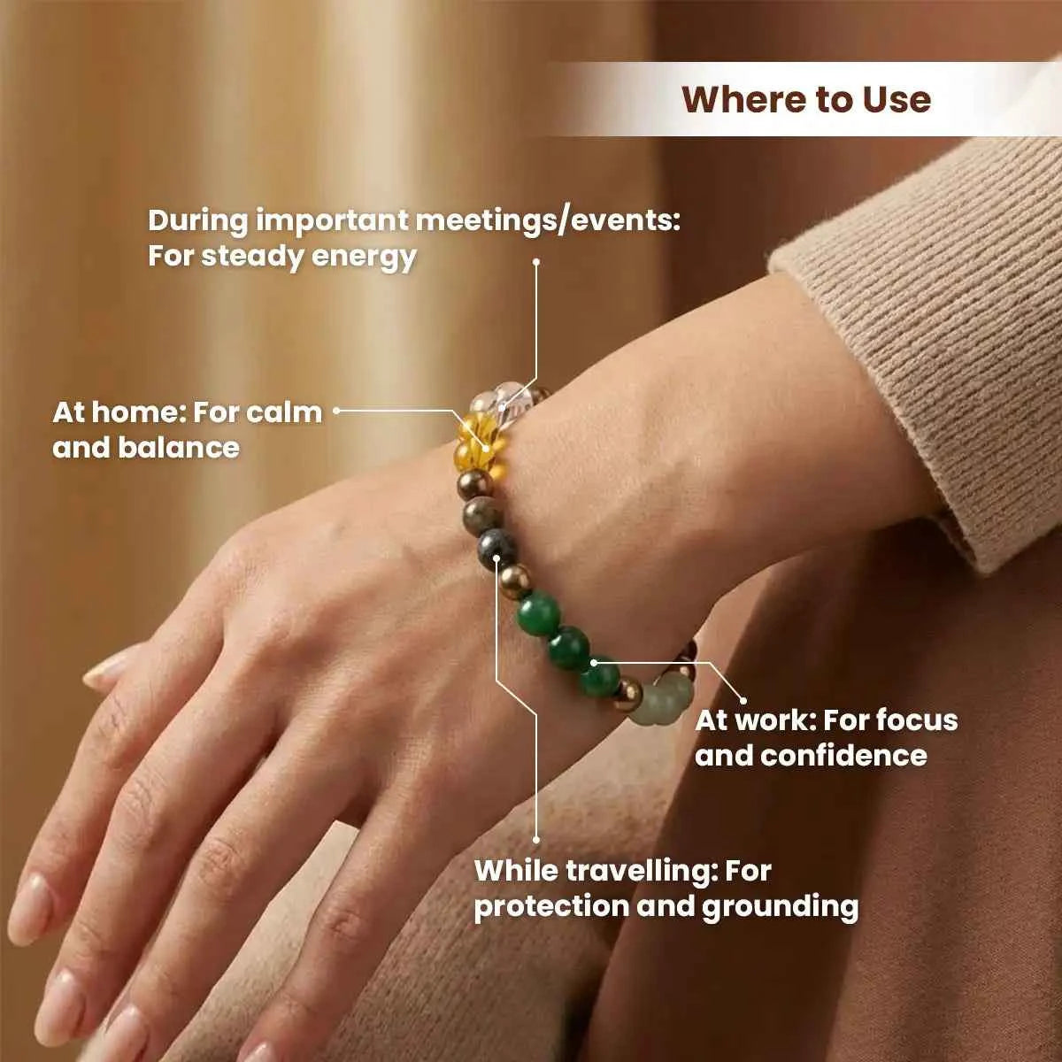 The Dhan Yog Bracelet is a powerful astrology wealth bracelet designed to attract financial stability, prosperity, and long-term growth. Crafted with a precise combination of natural gemstones, this prosperity bracelet works on both energy alignment and practical action, helping you stay focused, confident, and open to new income opportunities. This wealth gemstone bracelet supports consistent financial flow by strengthening clarity, decision-making, and self-confidence—key traits required for career growth and business success. It is especially suitable for professionals, business owners, and astrology beginners looking for a simple yet effective astrology remedy for money and abundance.