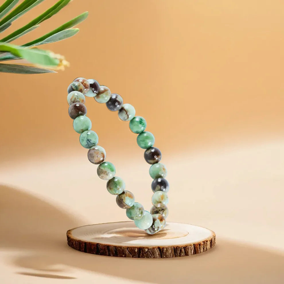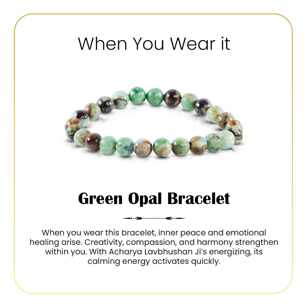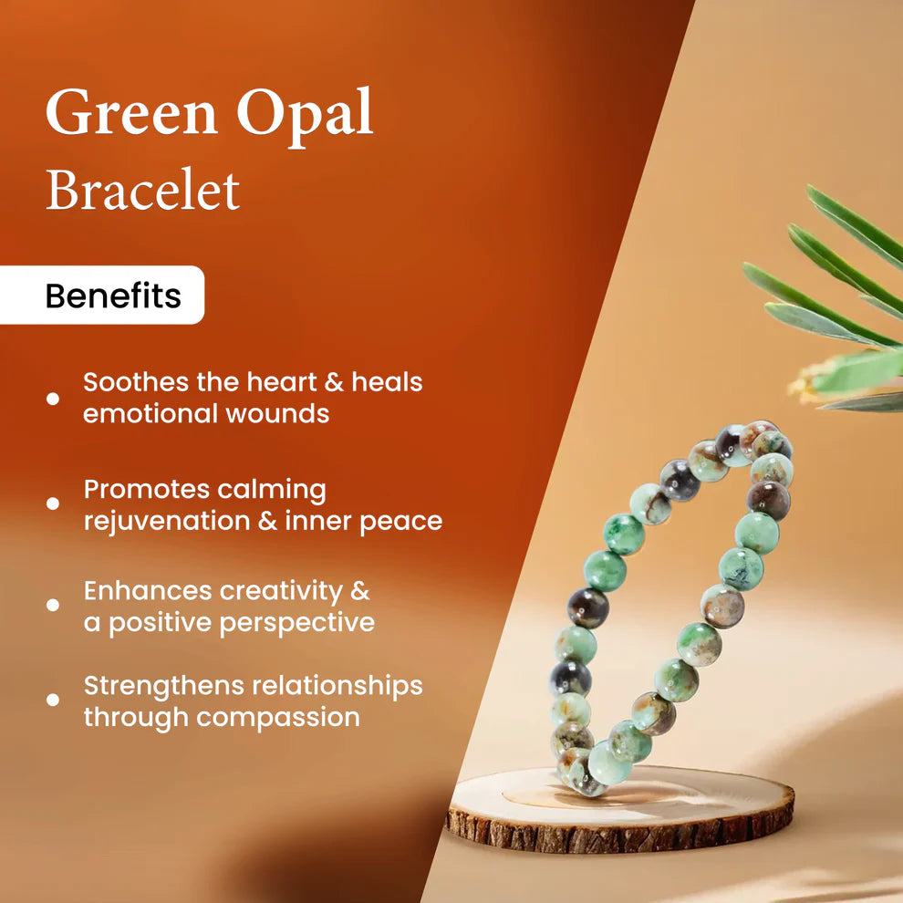 The Natural Green Opal Bracelet is crafted using carefully selected natural Green Opal crystal beads, known for their unique energetic properties. Each bead measures approximately 8 mm, making the bracelet comfortable for daily wear while maintaining strong energetic presence. This bracelet is designed for those seeking balance, emotional clarity, and steady personal growth. The smooth, polished Green Opal beads sit gently on the skin, making it suitable for long hours of wear. Every piece is quality-checked to ensure authenticity, durability, and consistency in bead size.