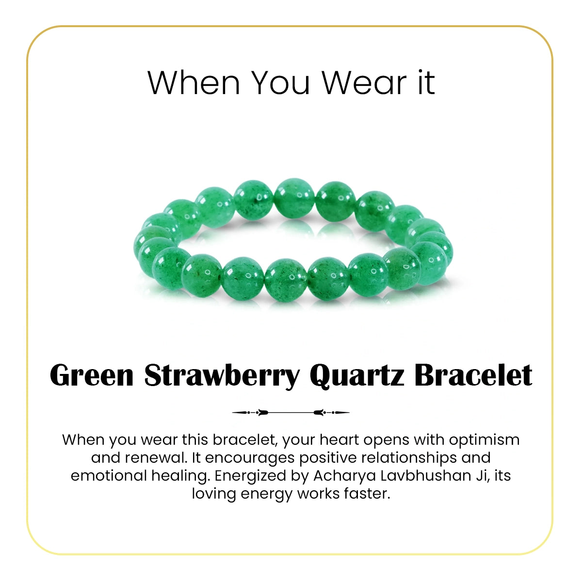 The Green Strawberry Quartz Bracelet promotes self-love, positivity, and emotional balance. It strengthens the heart chakra and supports spiritual growth.