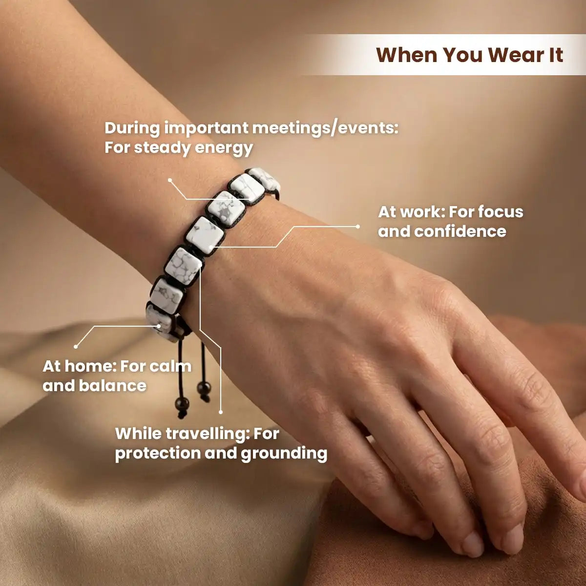 howlite bracelet acharya lavbhushan, natural howlite stone bracelet, calm patience stone, emotional balance bracelet, grounding crystal bracelet, spiritual healing stone, daily wear gemstone bracelet, mindfulness jewelry, when you wear it