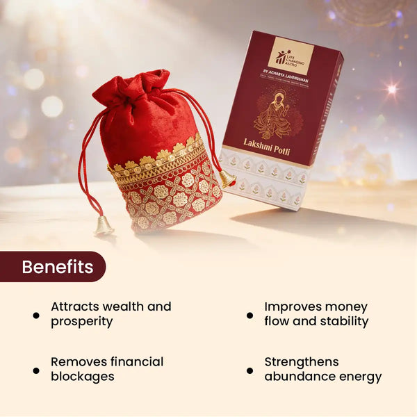 The Lakshmi Potli is a sacred prosperity remedy designed to attract wealth, abundance, and financial stability by invoking the blessings of Goddess Lakshmi. Rooted in traditional spiritual practices, this potli symbolises prosperity, growth, and continuous divine grace.