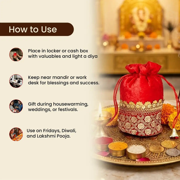 The Lakshmi Potli is designed to work passively, without complex rituals or chanting. Once placed correctly, it continuously radiates prosperity-focused energy. Suitable for both modern and traditional spaces. Prepared with spiritual intent and guided by traditional vastu and belief systems. Ideal for long-term placement and consistent results.