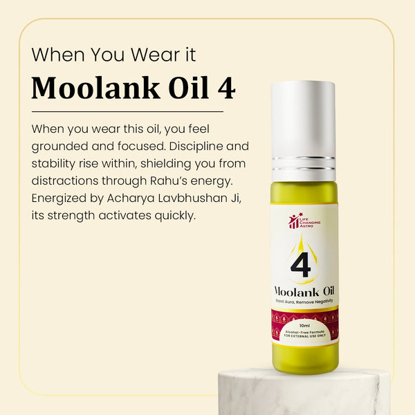 The Moolank 4 Oil is formulated for grounding, stability, and resilience, channeling the energy of Rahu. Ideal for those born on 4, 13, 22, 31, it promotes discipline and inner strength in daily life.