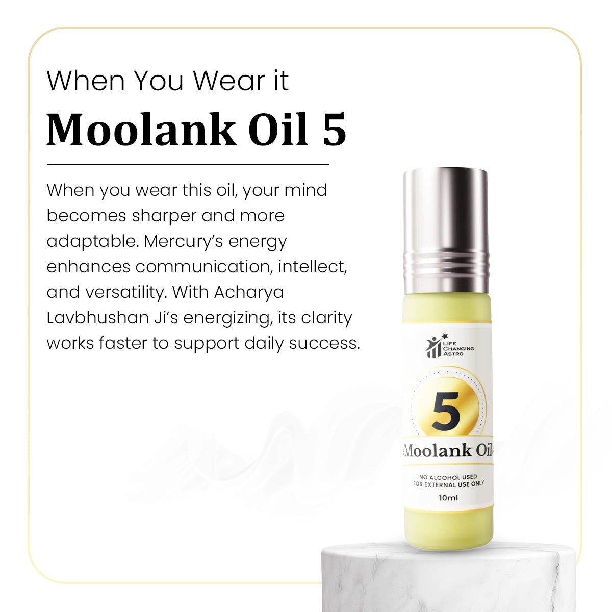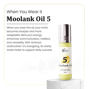 The Moolank 5 Oil is enriched with oils that enhance adaptability, intellect, and communication, aligned with Mercury’s (Budh’s) quick-witted energy. Ideal for those born on 5, 14, 23, it supports mental clarity and versatility.