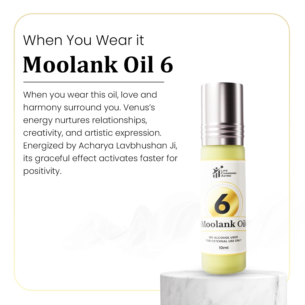 The Moolank 6 Oil combines natural fragrances to encourage love, harmony, and artistic expression, resonating with Venus’s (Shukra’s) graceful energy. Ideal for those born on 6, 15, 24, it helps attract positivity in relationships and creativity.