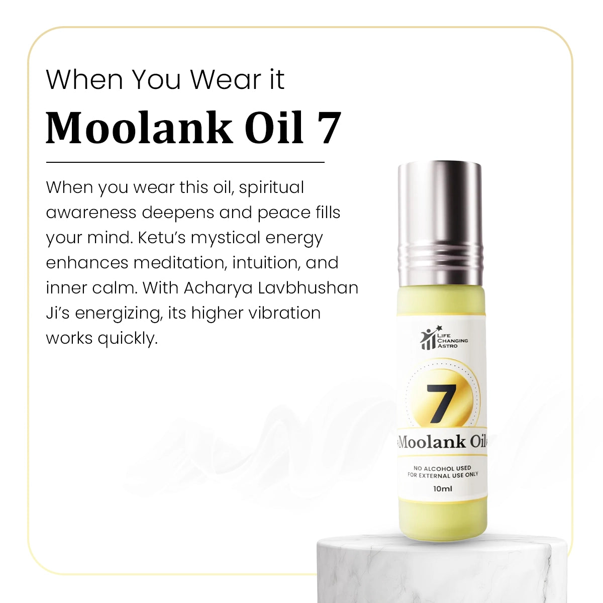 The Moolank 7 Oil is designed for spiritual growth, introspection, and calmness, infused with Ketu’s mystical energy. Ideal for those born on 7, 16, 25, it deepens meditation, intuition, and self-awareness.