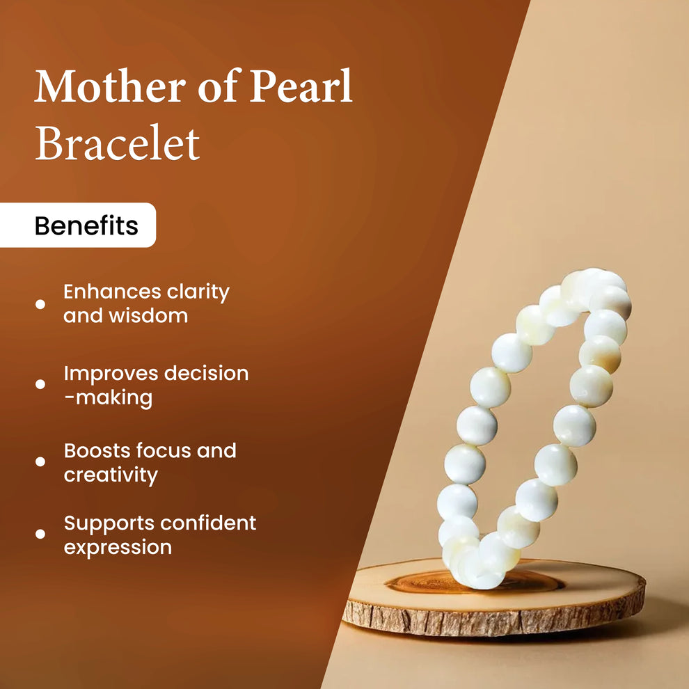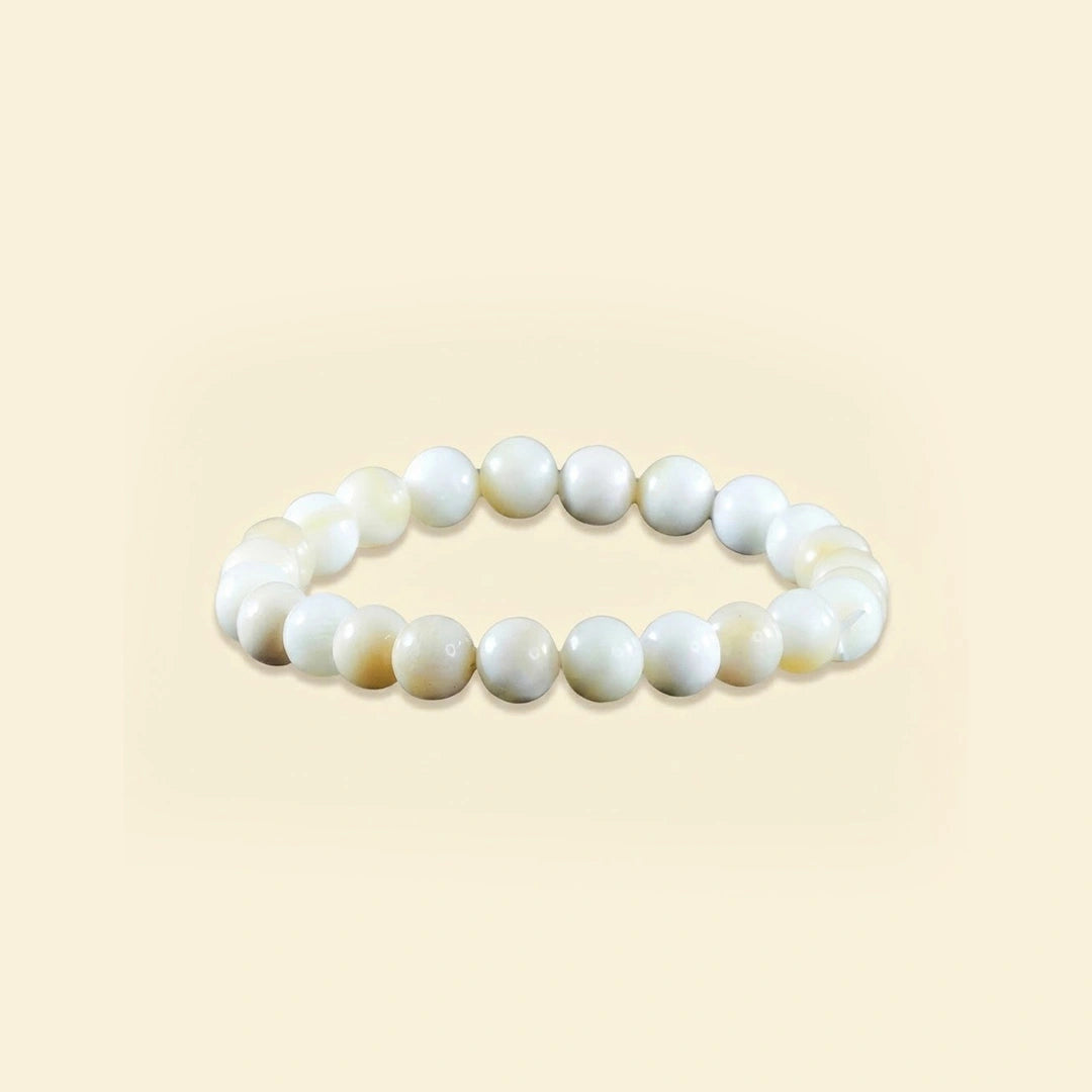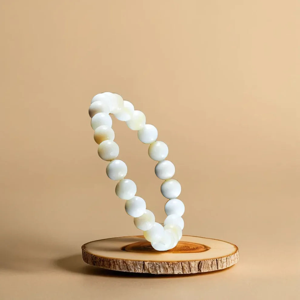 "The Natural Mother of Pearl Bracelet is crafted using carefully selected natural Mother Of Pearl crystal beads, known for their unique energetic properties. Each bead measures approximately 8 mm, making the bracelet comfortable for daily wear while maintaining strong energetic presence. This bracelet is designed for those seeking balance, emotional clarity, and steady personal growth. The smooth, polished Mother Of Pearl beads sit gently on the skin, making it suitable for long hours of wear. Every piece is quality-checked to ensure authenticity, durability, and consistency in bead size."