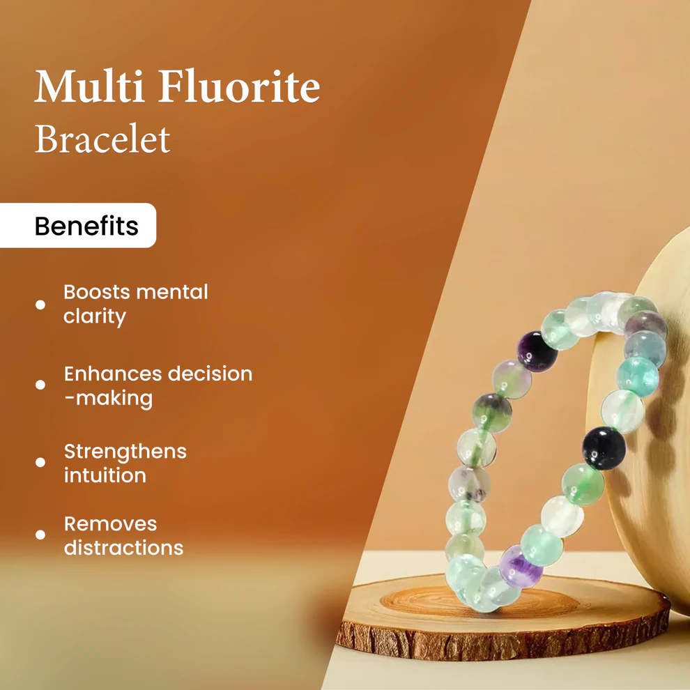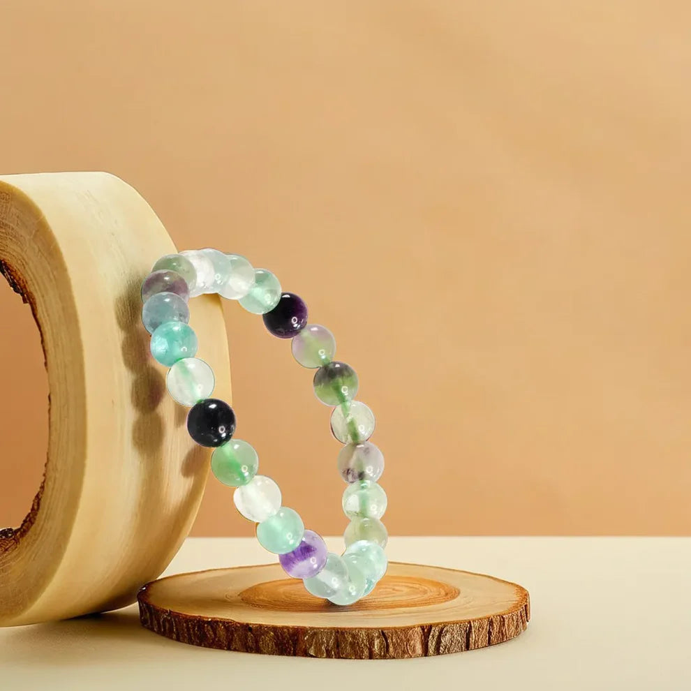 "The Natural Multi Fluorite Bracelet is crafted using carefully selected natural Multi Fluorite crystal beads, known for their unique energetic properties. Each bead measures approximately 8 mm, making the bracelet comfortable for daily wear while maintaining strong energetic presence. This bracelet is designed for those seeking balance, emotional clarity, and steady personal growth. The smooth, polished Multi Fluorite beads sit gently on the skin, making it suitable for long hours of wear. Every piece is quality-checked to ensure authenticity, durability, and consistency in bead size."