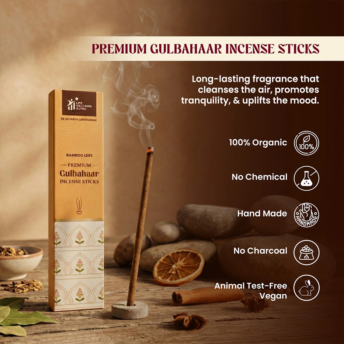 Premium Gulbahaar Incense Sticks are designed to deliver a balanced, pleasant floral aroma that enhances positivity and freshness in the space. The bamboo-less, charcoal-free formulation ensures minimal smoke and smooth burning, making them suitable for daily home use, offices, and spiritual practices. Ideal for maintaining an inviting and uplifting ambience. Fragrance Profile: Gulbahaar (Floral, Fresh) Ingredients: Cow dung base, natural floral aromatic blend, organic binding agents