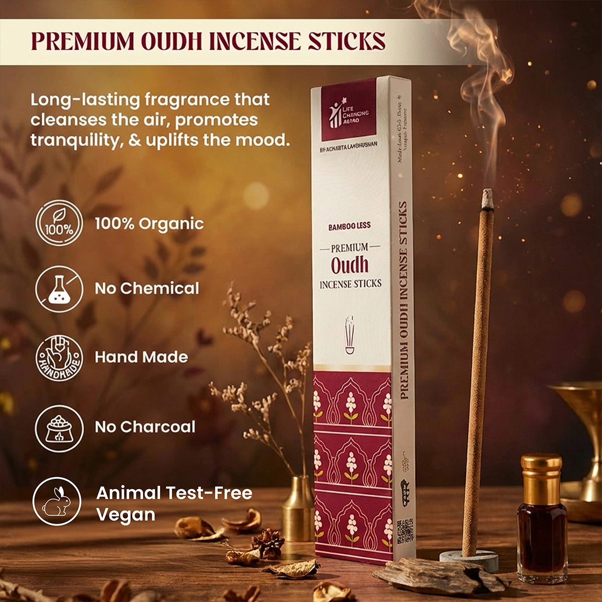 Oudh incense helps ground energy, calm the mind, enhance meditation, and purify the surrounding environment.