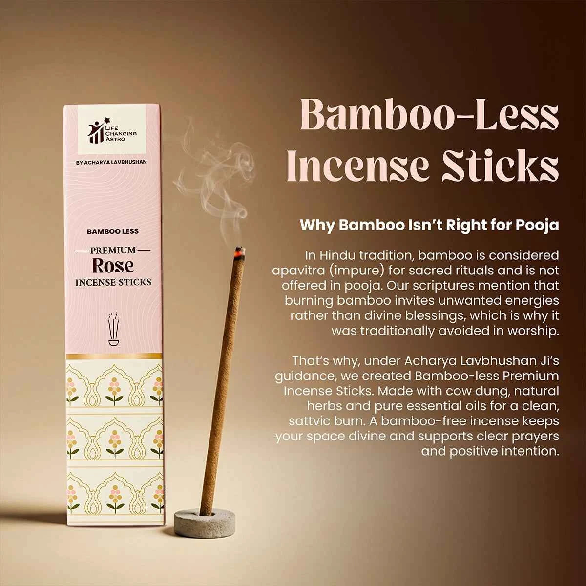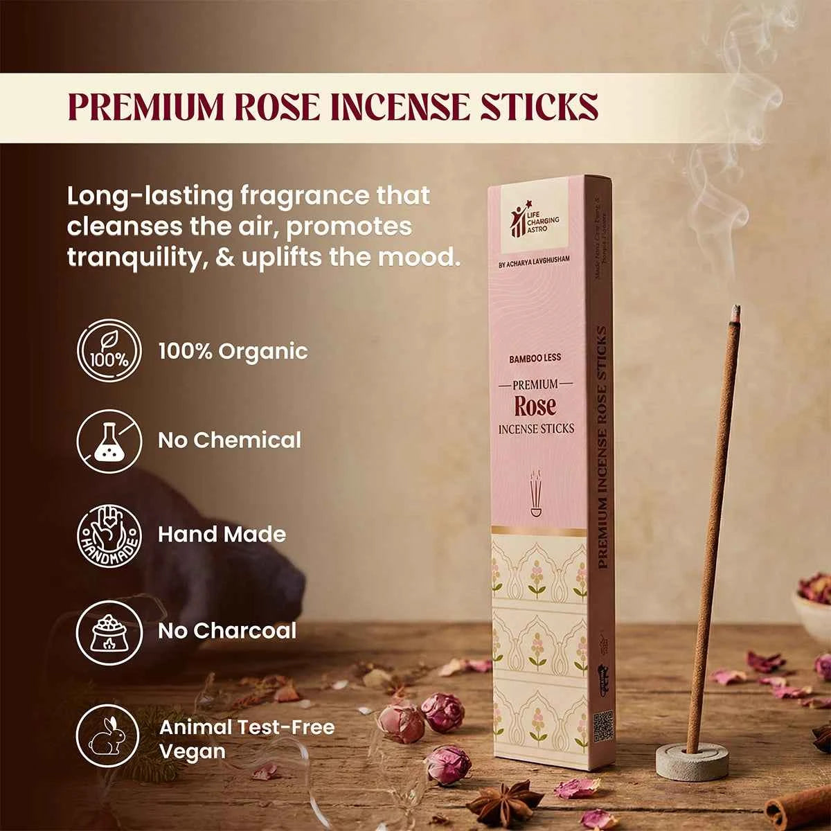 premium rose incense sticks, rose agarbatti, organic incense sticks, bamboo less incense, charcoal free agarbatti, cow dung incense sticks, floral incense for calm mind, soothing fragrance incense, incense by acharya lavbhushan